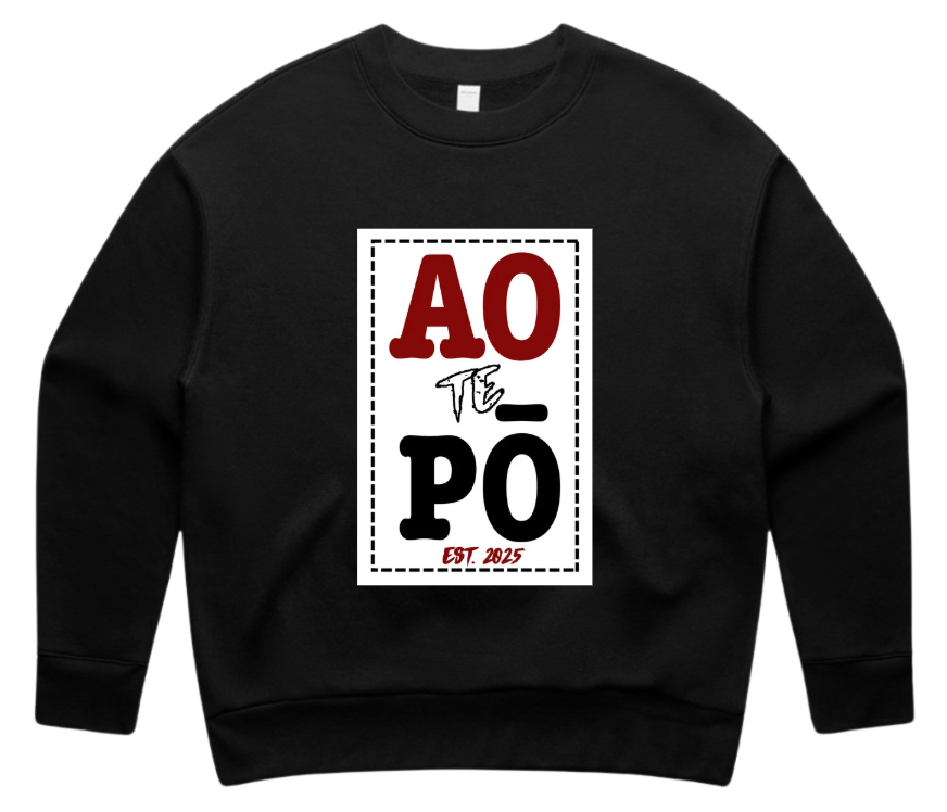 Our Ao te Pō OG crew is printed on a mid-heavy 350 GSM pullover fleece made with 80% cotton and 20% recycled polyester. Regular fit with inset sleeves, ribbed cuffs, and preshrunk for a lasting shape.
